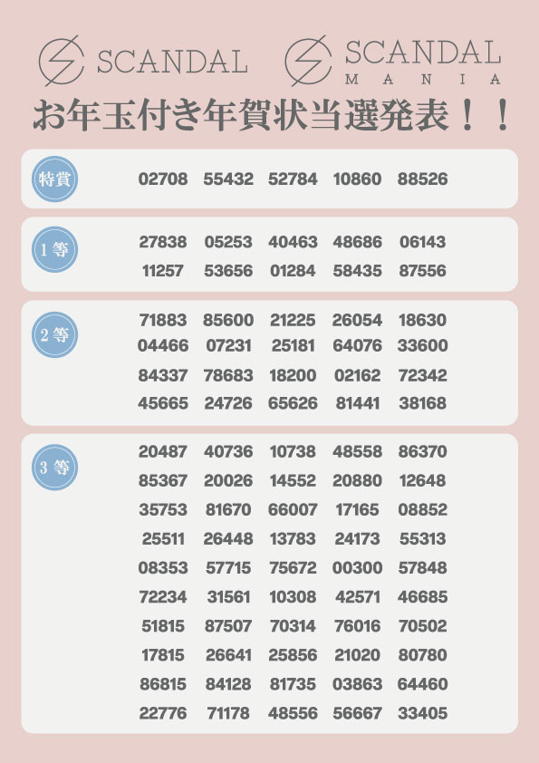 「SCANDAL福袋」「SCANDAL MANIA福袋」をご購入いただいたお客様にお送りしていた、【特典】お年玉付き年賀状の当選発表をいたします!